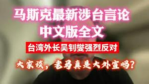 马斯克最新涉台言论,中文版全文。台湾外长吴钊燮强烈反对。大家说,老马真是大外宣吗?2023.09.13NO1992#马斯克#吴钊燮#台湾