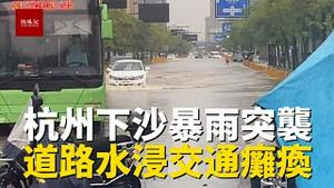 杭州下沙一场暴雨后,街道水浸严重,汽车被困高地,交通全瘫痪